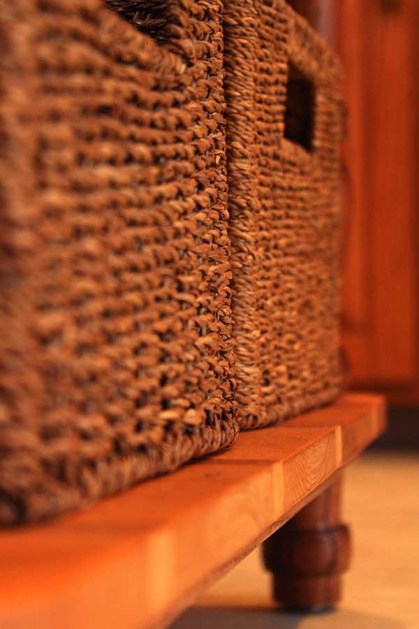 The shelves I’m especially proud of. I had originally planned on creating butchers block style shelves, but even though I tried to reinforce the wood it wasn’t structurally sound. I was able to repurpose the failed attempt and used it to create a nice effect by exposing the end-grain to the top of the shelf. With some blonde stain the end-product is much better than my original plan would have been.