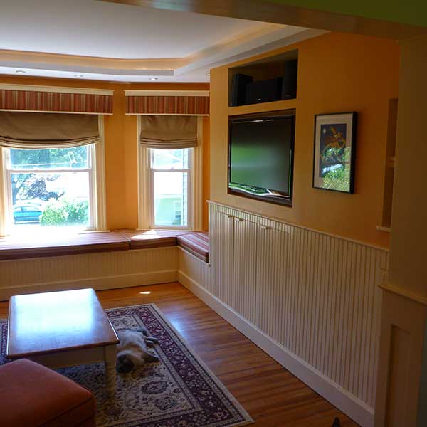 The window seat might be dynamic, but my favorite thing is the tray ceiling with lighting. I created a structure of ribs using steel frames that I finished with drywall. The space allowed me to install several small halogen spotlights, run wires for speakers. When complete I installed incandescent rope light which gives the room a nice diffuse light when watching a movie.